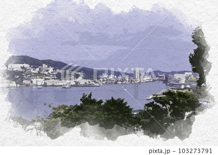 水彩画風 長崎市街地 グラバー園からの長崎港 長崎県長崎市