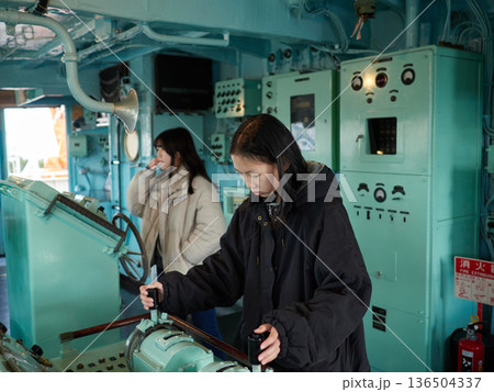 冬の名古屋港の観光スポット南極観測船ふじの操縦室で遊んでいる女子中学生の姿