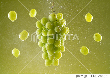 マスカットが水滴をまとい、空中で浮遊するジューシーな緑色の葡萄をクローズアップで捉えた新鮮なフルーツ
