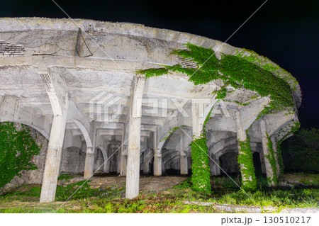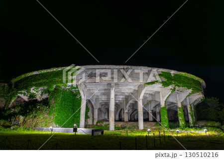 新潟県佐渡市相川北沢町 佐渡金山の選鉱所の遺構である北沢浮遊選鉱場のシックナーライトアップ