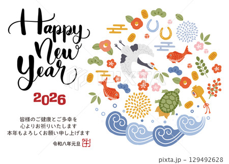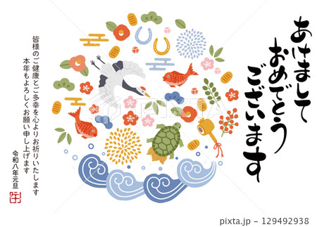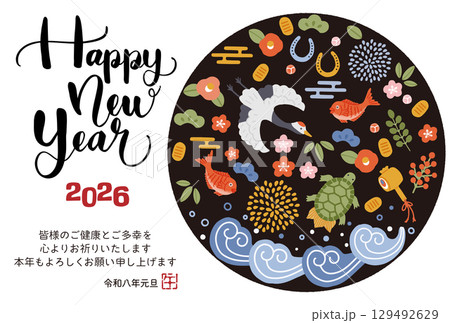 2026年午年年賀状 鶴亀や松竹梅など縁起物のイラスト