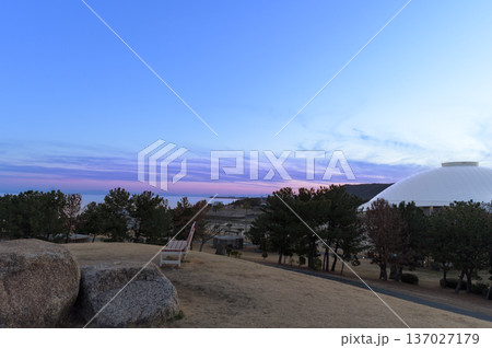夕焼けの海とドームが見える公園の丘の風景