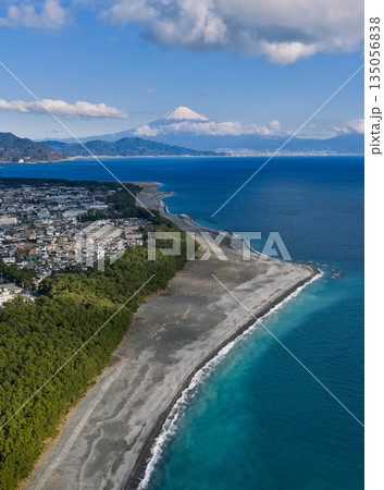 三保松原の海岸線と松林越しに望む富士山と駿河湾の空撮風景