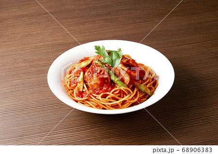 帆立とイカの魚介類が入ったトマトソースのパスタ【真俯瞰】