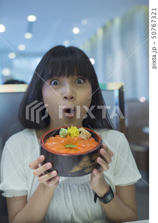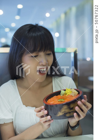 Close up women enjoy eating sashimi Japanese food.
