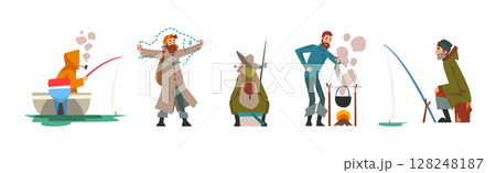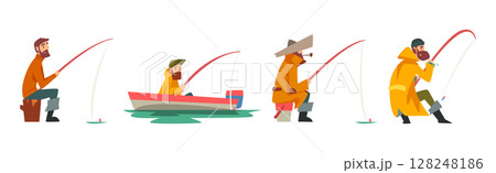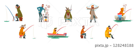 Happy Fisherman Character Catching and Angling in Pond or River Vector Set