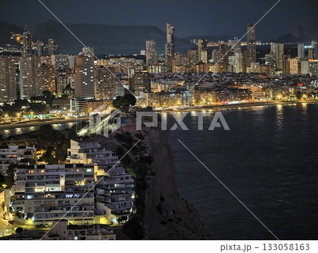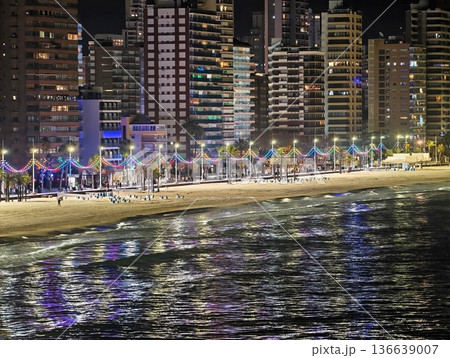 nighttime coastal cityscape bustling, vivid skyline over busy beach with glowing neon reflections