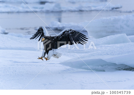 流氷上に着地するオオワシ成鳥