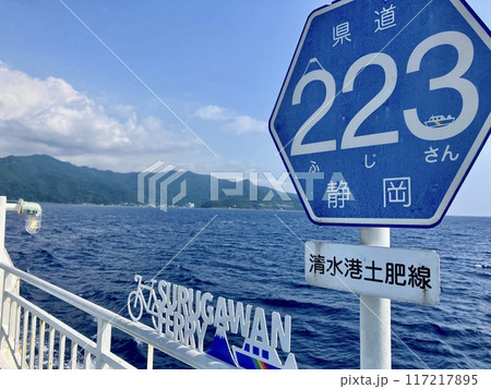 県道223号清水港土肥線の標識_駿河湾フェリーの航路が県道223号線