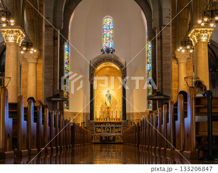 豪華なシャンデリア チャペルステンドグラスのブライダルイメージ画像