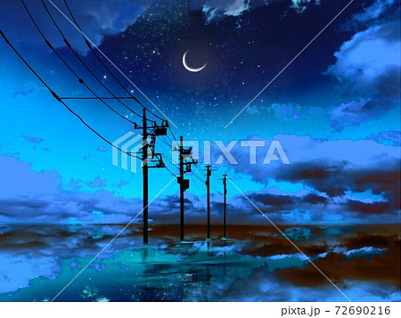 青く輝く夜空が反射した海と地平線へ消える電信柱と輝く星々の幻想的な風景画