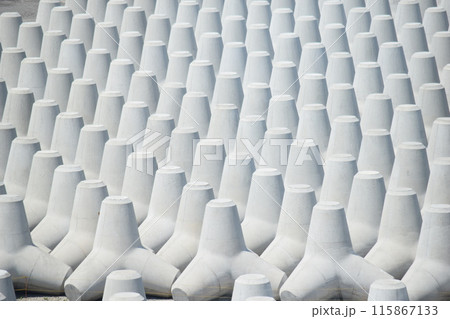 海の護岸に積み上げられた消波ブロックテトラポッド