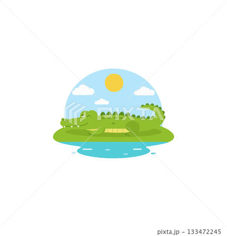 Whimsical alligator lounging on a verdant isle under a sunny sky a cartoon style illustration