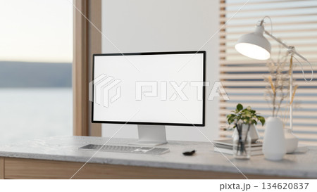 White screen computer with books and decors aside lamp on marble table in a bedroom or living room.