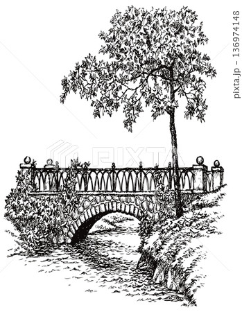 Vector landscape. A maple near the ancient stone bridge over a small river