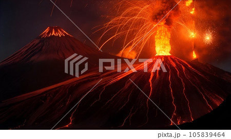 夜の空に浮かび上がる火山と噴煙