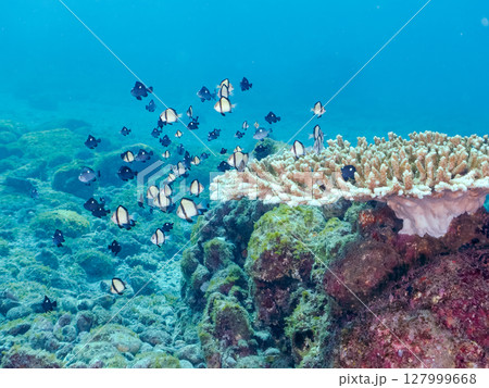 テーブルサンゴのフタスジリュウキュウスズメダイ幼魚他の群れヒリゾ浜中木南伊豆町伊豆半島静岡県2024