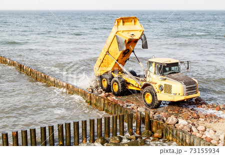 heavy truck during the construction of a breakwater
