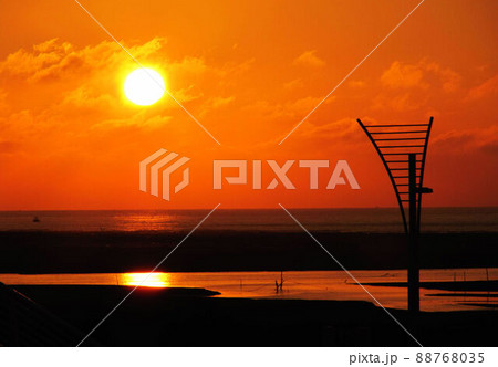 美麗夕陽和夕彩在天邊,海面也反射了天空的雲彩。