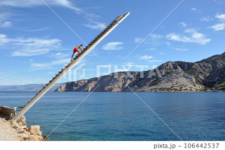 Lifeguard on a wooden ladder above the sea