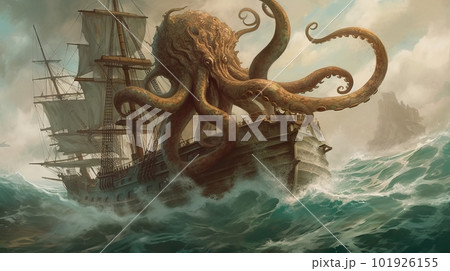 クラーケンに襲われる帆船:AI作品
