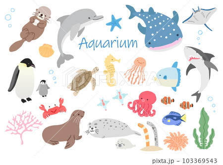 水族館にいるかわいい生き物たちのイラストセット 手書き水彩