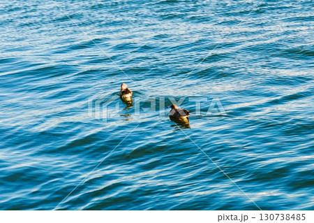 Serene morning on coast showing gulls floating peacefully with reflective waves and distant buoy