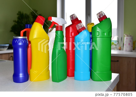 Detergent bottles at kitchen in home. Detergents and laundry concept. Household chemicals
