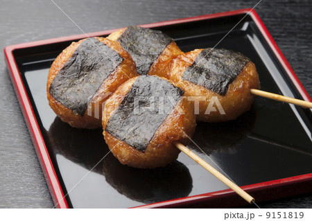 串に刺して海苔を付けたイモ餅