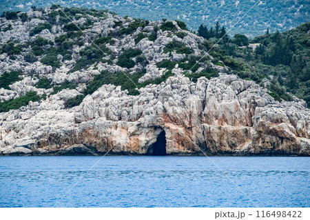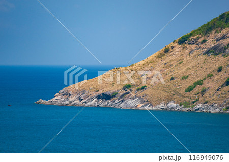 Aerial view seashore with mountains at Phuket Thailand, Beautiful seacoast view at open sea in summer season,Nature recovered Environment and Travel background