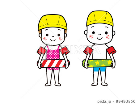 アームヘルパーと浮き輪を付けた水着姿の子どもたち スイミングキャップ