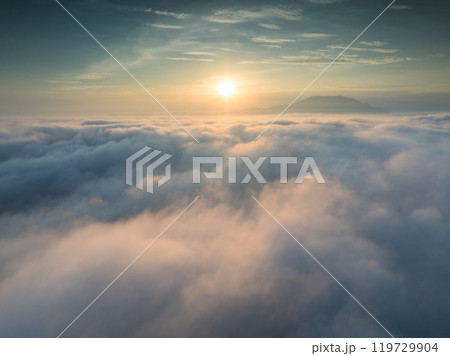 Aerial view drone flying over sea of fog at sunrise, Vietnam