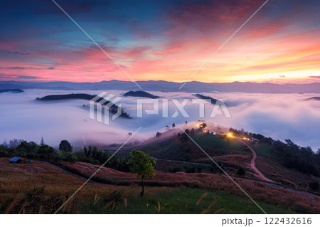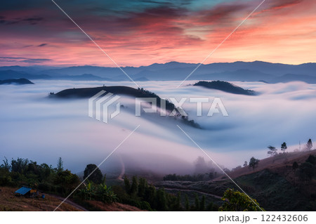 Landscape of sea of fog flowing over mountain with homestay on hill in countryside at Mae Jam, Chiang Mai