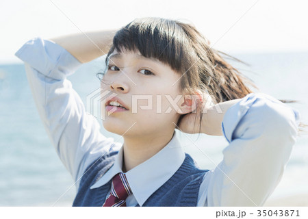 女子高生 海風 髪がなびく