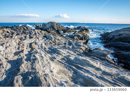 三浦市三崎町・冬晴れの海岸に広がる白い岩礁と青い海の風景