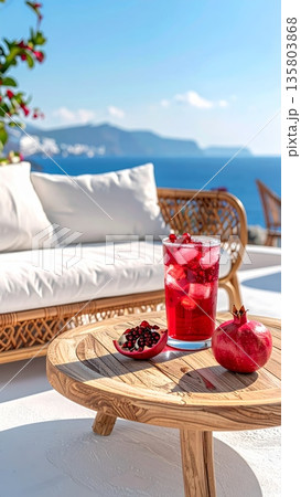Pomegranate Juice on Wooden Coffee Table by Mediterranean Balcony