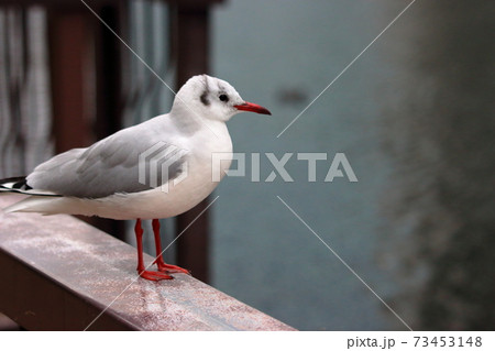 Blackheaded seagull, yurikamome, standing on a fence by Tokyo Bay