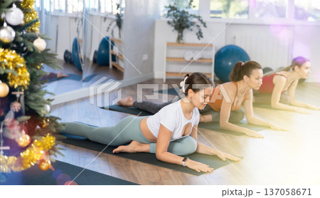 Young beautiful girl with other people relaxing and enjoying yoga in fitness center during Christmas holidays