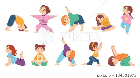 Kid yoga. Child characters doing sport exercise, children gym and balance pose or baby girl healthy activity, toddler stretch in asana. Physical body training. Vector cartoon flat isolated set