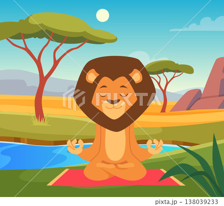 Lion outdoor. desert landscape with wild cartoon lion sitting in yoga positions