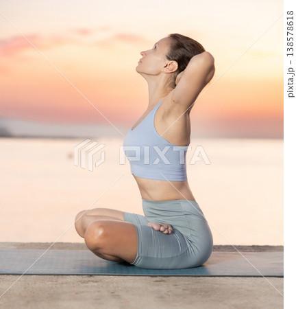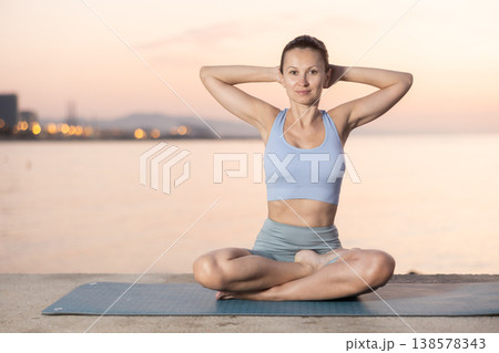 Young beautiful woman relaxing and enjoying yoga on beach at sunrise, meditation in lotus pose with hands behind head