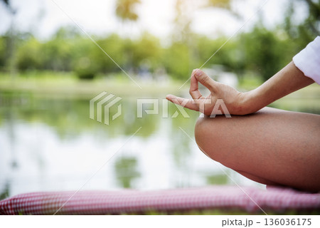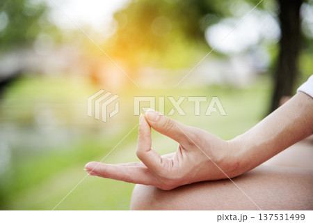Fit asian woman doing yoga meditation in park fitness and heakthy outdoor concept