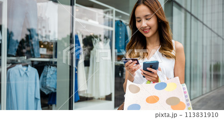 Fashion accessory overload ,young woman with shopping bags, smartphone, and credit card in front of a store window. Retail therapy for the fashion-savvy