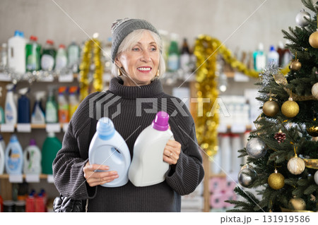 Elderly woman buyer chooses detergent in decorated household chemicals store