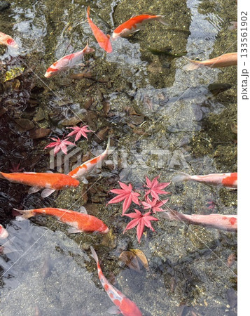 栃木県佐野市出流原弁天池の鯉が泳ぐ神秘的な景色