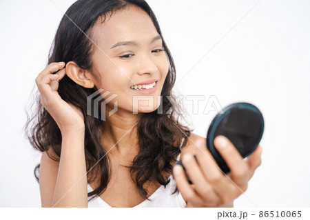beautiful young asian woman looking at her face on mirror