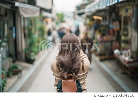 Woman tourist Visiting in Enoshima Island, Fujisawa, Kanagawa, Japan. happy Traveler sightseeing Enoshima Shrine. Landmark and popular for tourists attraction near Tokyo. Travel and Vacation concept