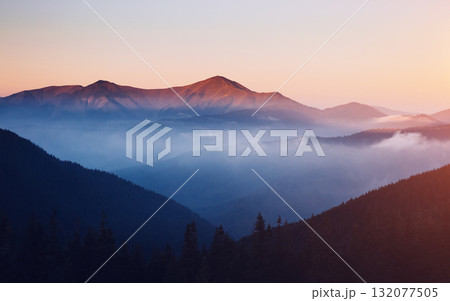 View of the misty valley. Location Carpathian, Ukraine, Europe.