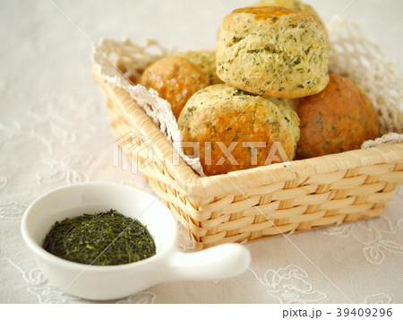 煎茶のスコーン かご盛り (横位置ハイアングル)