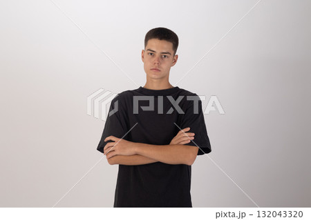 The man is standing with his arms crossed